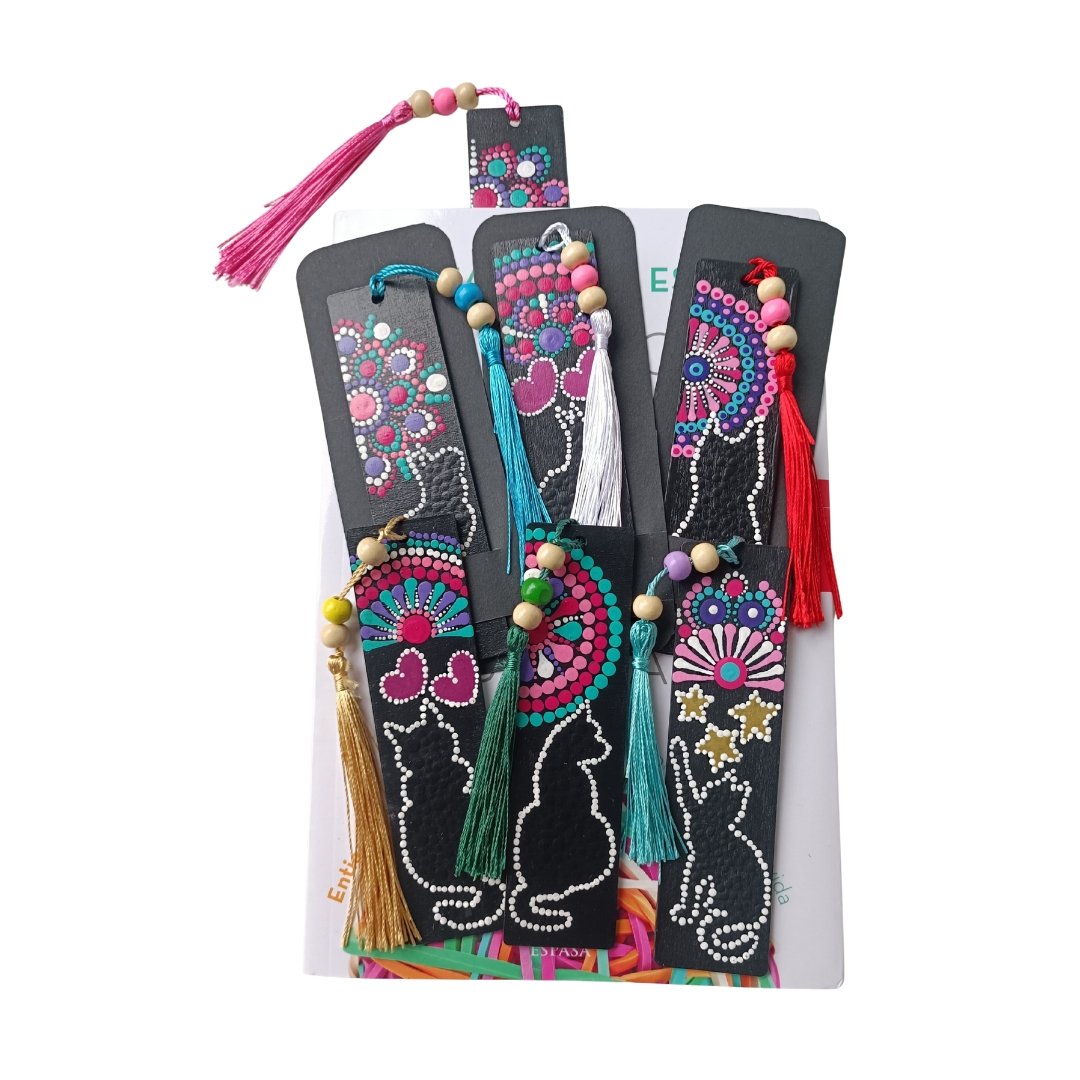 Separador de libros elaborado artesanalmente con la técnica de puntillismo y decorado con encantadores diseños de gatos. Cada pieza es única y aporta un toque creativo, colorido y especial a tus lecturas favoritas. Ideal para quienes aman los detalles artísticos y originales.